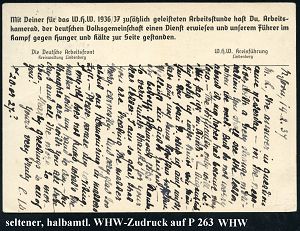 1516 | 40 € | WINTERHILFSWERK / W.H.W. : NONNENHORN/ am/ BODENSEE.. 1937 (15.2.) HWSt auf Sonder-P. 6 + 4 Pf. WHW: Hitlers 1. Spatenstich Reichsautobahn + rs. amtl. WHW-Zudruck Kreisführung Lindenberg mit Propaganda-Text (Mi.PZD 263) seltene Bedarfs-Kt. (Bo.1, Letztjahr) | ![]() ![]() | |