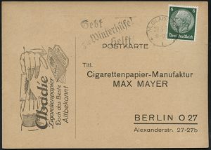 1515 | 15 € | WINTERHILFSWERK / W.H.W. : M.GLADBACH/ *1o/ Gebt/ zur Winterhilfe!/ Helft! 1934 (29.3.) Serien-MWSt auf Zigarettenpapier-Reklame-Kt. (Bo.S 144 A) | ![]() | |