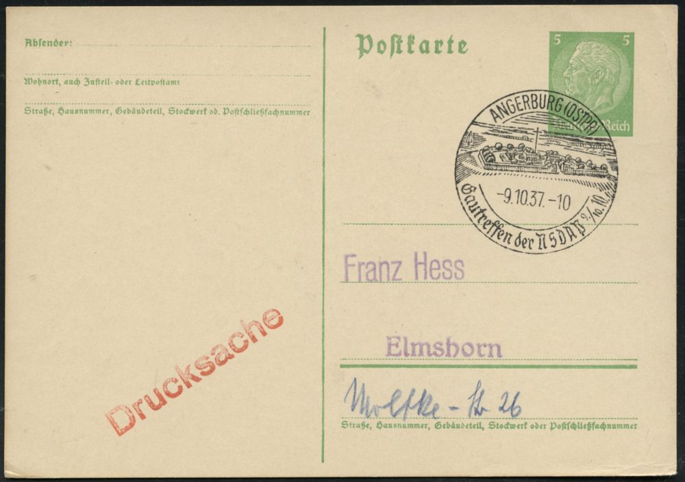 1550 | 15 € | NATIONALSOZIALISTISCHE DEUTSCHE ARBEITERPARTEI / N.S.D.A.P. : ANGERBURG (OSTPR)/ Gautreffen der NSDAP 1937 (9.10.) seltener SSt = "Helden"-Friedhof Jägerhof (= Kämpfe in Schlesien, Grenzschutz 1919), klar gest. Inl.-Bf. (Bo.4) | ![]() | |