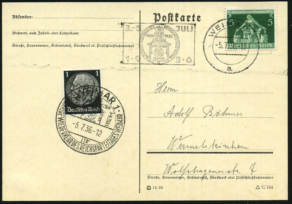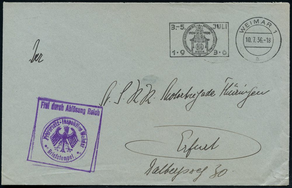1575 | 18 € | NATIONALSOZIALISTISCHE DEUTSCHE ARBEITERPARTEI / N.S.D.A.P. : WEIMAR 1/ a/ 1926 1936/ 10 JAHRE WIEDERKEHR DES REICHSPARTEITAGES.. 1936 (10.7.) MaWSt = NSDAP-Standarte "Deutschland erwache" + viol. Ra.: FdAR/Wehrersatz-Inspektion Weimar (gering gedoppelt) alter Weimarer Adler!, Wehrmachts-Dienstbf. (Bo.11 A I) | ![]() | |