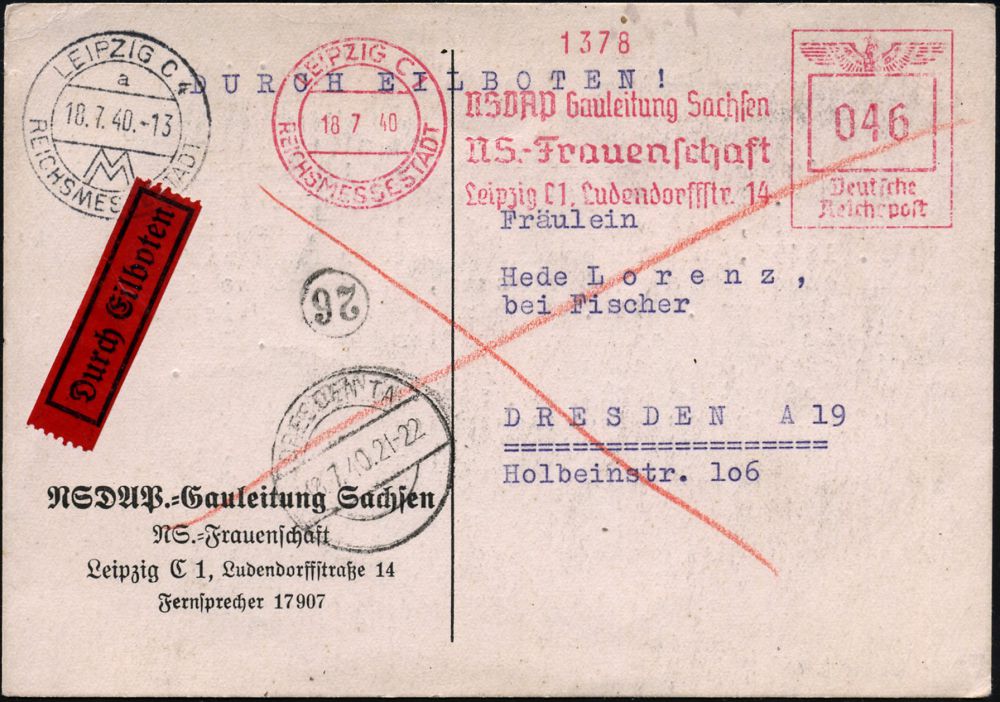 1561 | 30 € | NATIONALSOZIALISTISCHE DEUTSCHE ARBEITERPARTEI / N.S.D.A.P. : LEIPZIG C1/ REICHSMESSESTADT/ NSDAP Gauleitung Sachsen/ NS.-Frauenschaft.. 1940 (18.7.) AFS Francotyp "Reichsadler" 046 Pf. + HWSt.: LEIPZIG C 4/a/MM/REICHSMESSESTADT (Bo.128) Dienst-Eil-Karte n. Dresden, seltenes Porto! (Dü.E-5CGh) | ![]() | |
