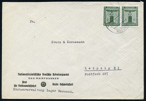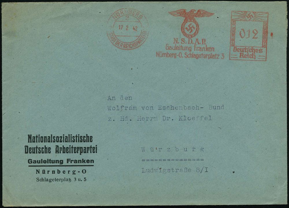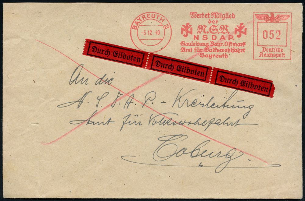 1551 | 30 € | NATIONALSOZIALISTISCHE DEUTSCHE ARBEITERPARTEI / N.S.D.A.P. : BAYREUTH 2/ Werdet Mitglied/ der/ N.S.V./ NSDAP/ Gauleitung Bayr.Ostmark.. 1940 (5.10.) AFS Francotyp "Reichsadler" 052 Pf. (2x NSV-Monogramm) dekorativer Fern-Eil-Bf. n. Coburg, seltenes Porto! (Dü.E-5CGo) | ![]() | |