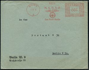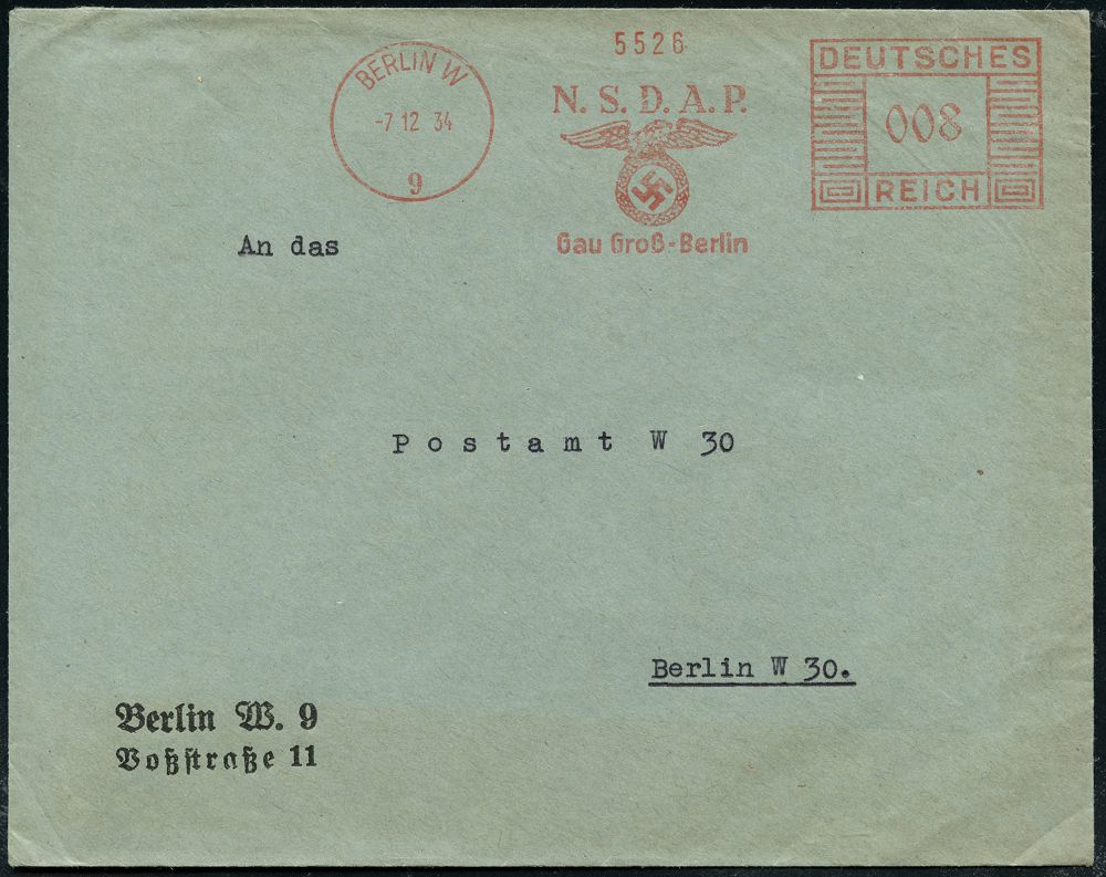 1552 | 18 € | NATIONALSOZIALISTISCHE DEUTSCHE ARBEITERPARTEI / N.S.D.A.P. : BERLIN W/ 9/ N.S.D.A.P./ Gau Groß-Berlin 1934 (7.12.) AFS Francotyp (Hakenkreuz-Adler) klar gest. Orts-Bf. (Dü.E-2CEh) | ![]() | |