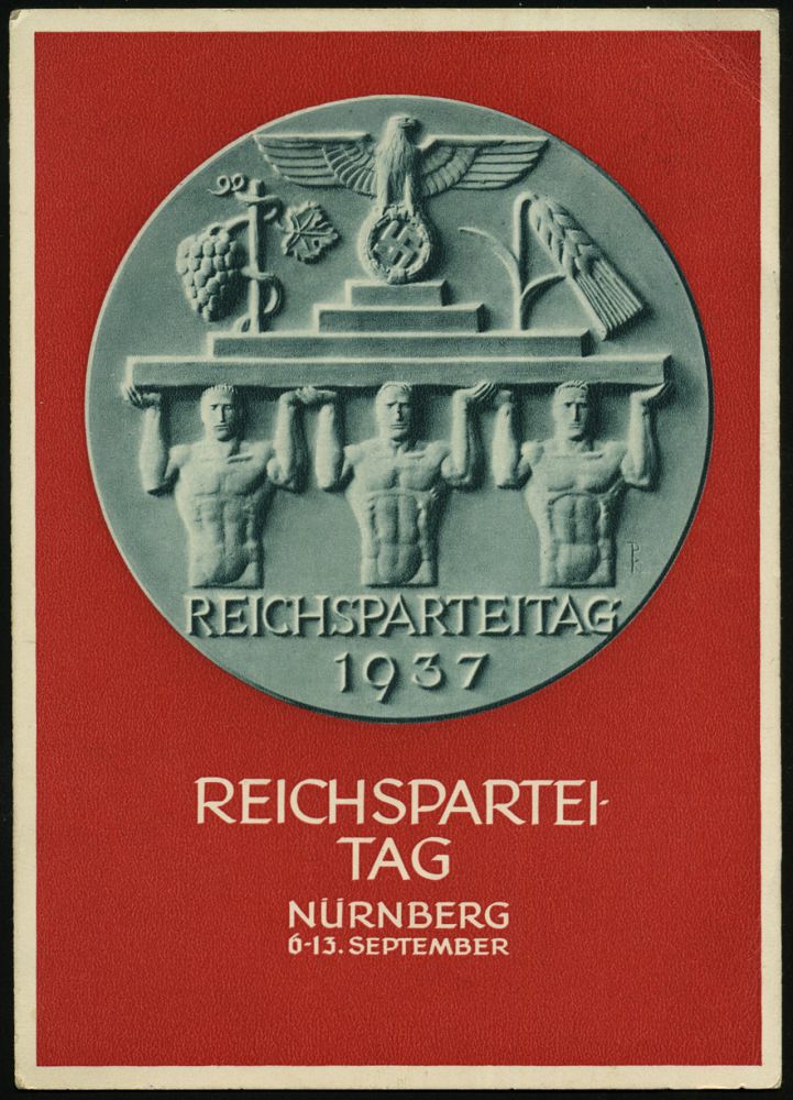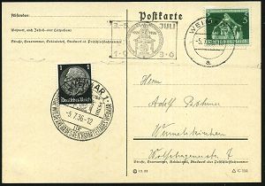 1570 | 35 € | NATIONALSOZIALISTISCHE DEUTSCHE ARBEITERPARTEI / N.S.D.A.P. : NÜRNBERG/ a/ Reichsparteitag der NSDAP 1937 (11.9.) SSt mit UB "a" auf EF 6 Pf. "Reichsparteitag 1937" (Mi.650 EF + 24.- EUR) + seltener 2K: FAHBARES TELEGRAPHENAMT NR.1/b = mobiles Postamt, klar gest. Propaganda-Ak.: "Festpostkarte Reichsparteitag NSDAP" (Relief), seltene Bedarfs-Inl.-Kt. von Teilnehmern! (Bo.52 a) | ![]() ![]() | |