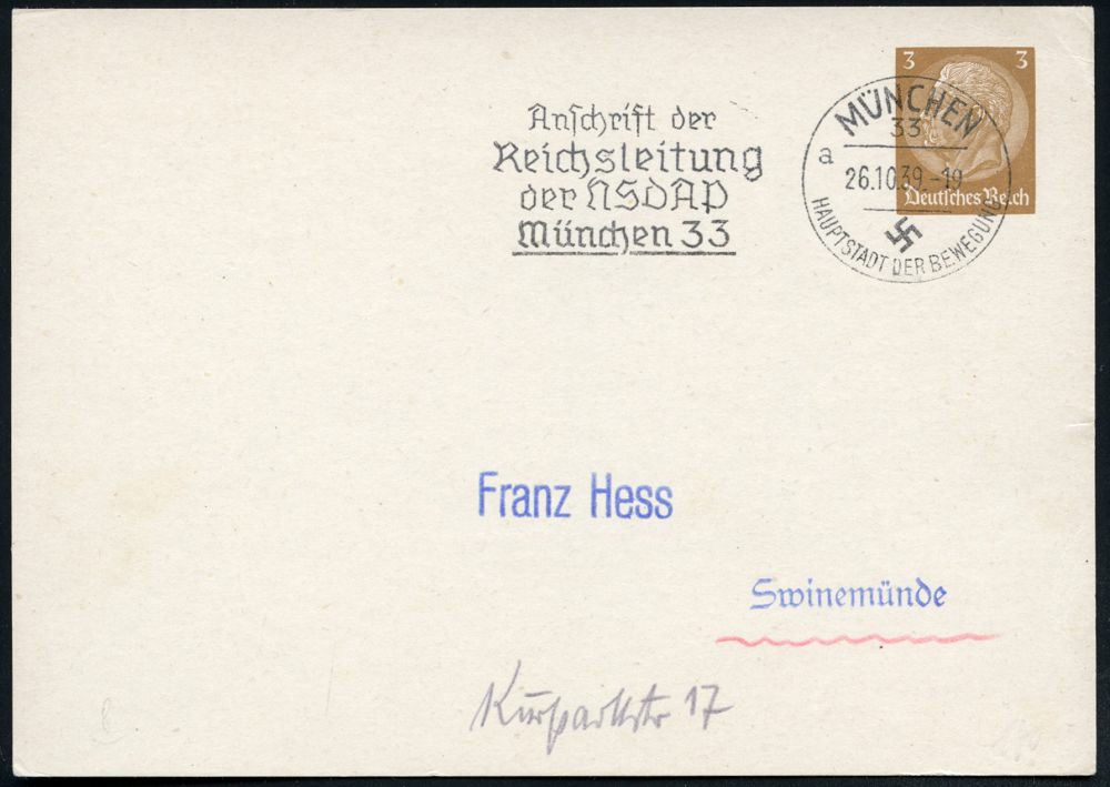 1564 | 18 € | NATIONALSOZIALISTISCHE DEUTSCHE ARBEITERPARTEI / N.S.D.A.P. : MÜNCHEN/ 33/ a/ HDB/ Anschrift der/ Reichsleitung/ der NSDAP/ München 33 1939 (26.10.) seltener MWSt auf PP 3 Pf. Hindenbg. (Mi.PP 122/A 1 = blanco) Inl.-Karte (Bo.140 A , nur 1939-41) | ![]() | |