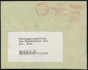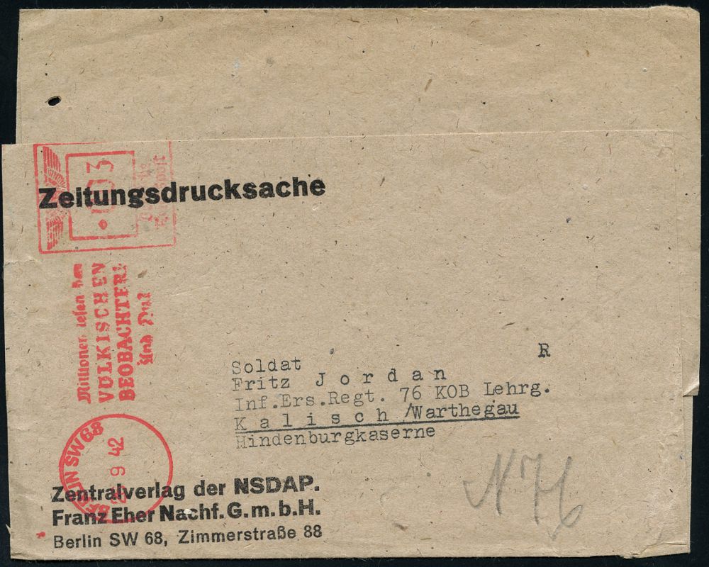 1553 | 30 € | NATIONALSOZIALISTISCHE DEUTSCHE ARBEITERPARTEI / N.S.D.A.P. : BERLIN SW 68/ Millionen lesen den/ VÖLKISCHEN BEOBACHTER.. 1942 (26.9.) AFS Francotyp "Reichsadler" 003 Pf. auf Zeitungs-Sb: Zentralverlag der NSDAP, Franz Eher Nachf. GmbH.. an Feldpost-Adresse im Warthegau, nicht portofrei!, seltene Verwendung! (Dü.E-5AG) | ![]() | |