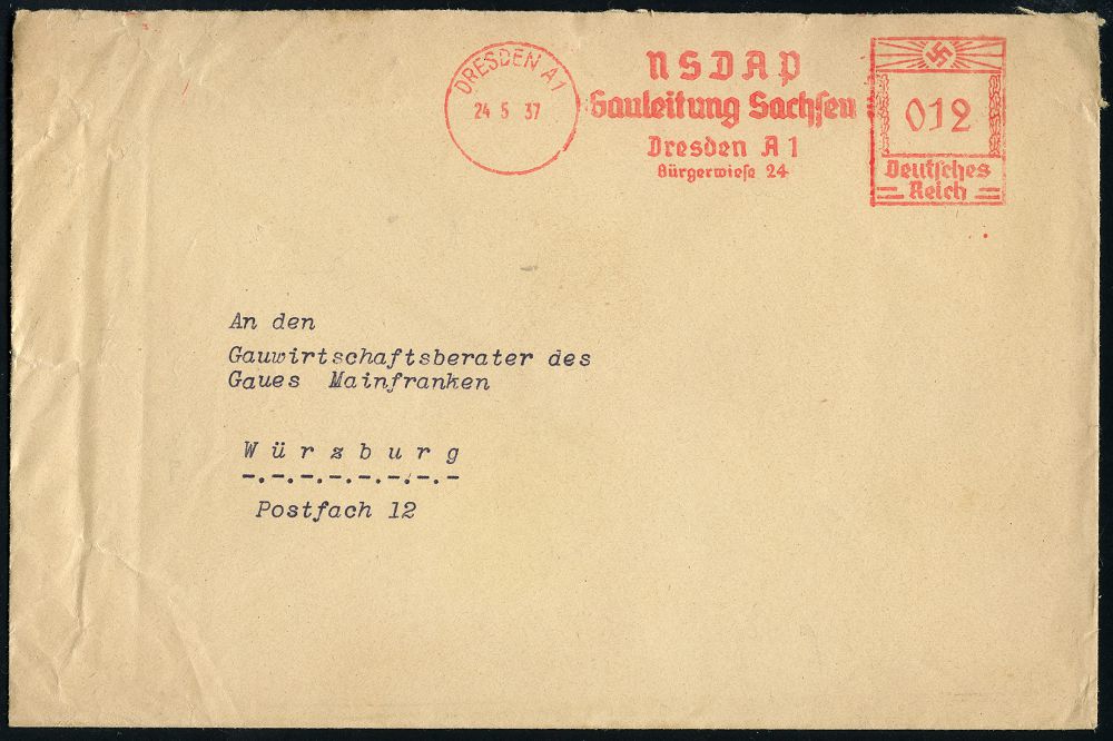1554 | 18 € | NATIONALSOZIALISTISCHE DEUTSCHE ARBEITERPARTEI / N.S.D.A.P. : DRESDEN A 1/ NSDAP/ Gauleitung Sachsen.. 1937 (24.5.) AFS Francotyp "Hakenkreuz" klar auf Fern-Bf. (Dü.E-3CEo) | ![]() | |