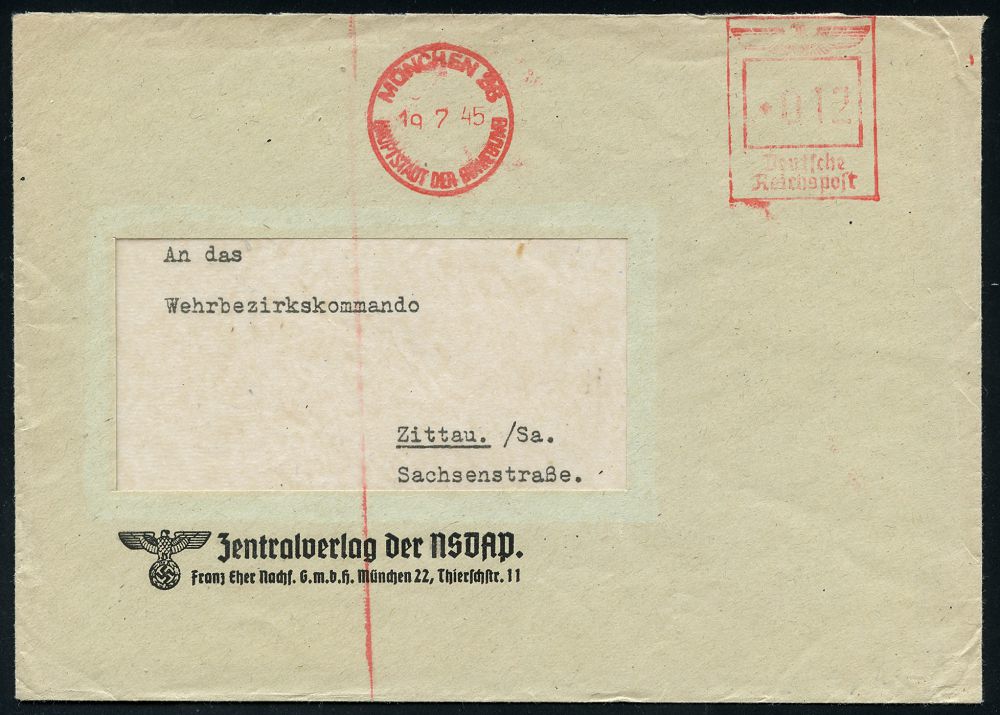 1565 | 25 € | NATIONALSOZIALISTISCHE DEUTSCHE ARBEITERPARTEI / N.S.D.A.P. : MÜNCHEN 26/ HDB 1945 (10.2.) seltener, später AFS Francotyp "Reichsadler" ohne Werbeklischee, kriegsbedingt ? = entfernt (aptiert) Dienst-Bf.: Zentral-Verlag der NSDAP.. (NS-Adler), seltener Beleg! (Dü.E-5AGo) | ![]() | |