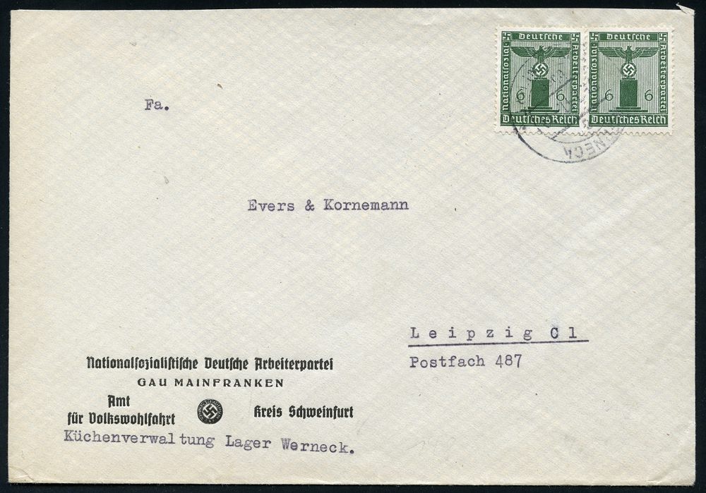 1573 | 16 € | NATIONALSOZIALISTISCHE DEUTSCHE ARBEITERPARTEI / N.S.D.A.P. : WERNECK/ e/ über/ SCHWEINFURT 1941 (31.7.) 2K-Steg = PSt.I auf Paar Parteidienst 6 Pf. grün , Dienst-Bf.: NSDAP GAU MAINFRANKEN.. + Zusatz "Küchenverwaltung Lager Werneck.", Fern-Bf. (Mi.D 148 MeF) | ![]() | |