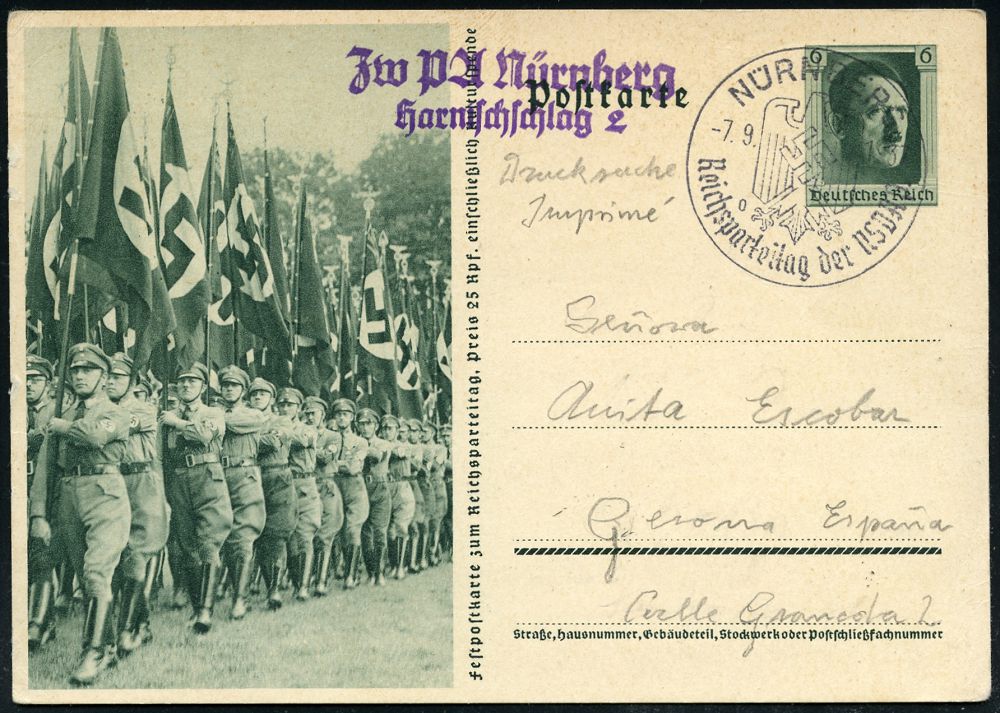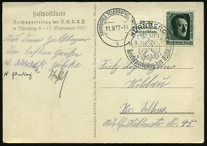 1569 | 25 € | NATIONALSOZIALISTISCHE DEUTSCHE ARBEITERPARTEI / N.S.D.A.P. : NÜRNBERG/ o/ Reichsparteitag der NSDAP 1937 (7.9.) SSt mit UB "o" = NS-Adler + seltener viol. 2L: Zw PA Nürnberg/ Harnischschlag 2 (Marschlager der NSDAP-Teilnehmer) passende BiP 6 Pf. Hitler: SA Fahnenträger (Mi.P 264/04) Inl.-Karte (Bo.52 o) | ![]() | |