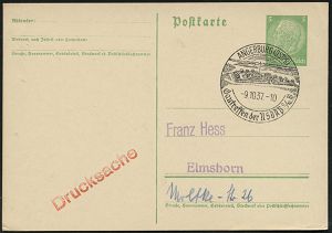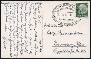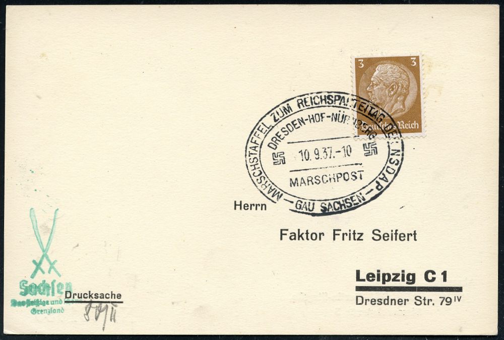 1555 | 16 € | NATIONALSOZIALISTISCHE DEUTSCHE ARBEITERPARTEI / N.S.D.A.P. : DRESDEN-HOF-NÜRNBERG/ MARSCHPOST.. 1937 (10.9.) Oval-SSt mit Lücke = mobiles PA für Marsch-Teilnehmer + grüner HdN: Sachsen.. (gekreuzte sächs. Kurs-Schwerter) klar gest. Inl.-Drs.-Karte (Bo.80 Ty.II) | ![]() | |