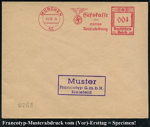 1562 | 45 € | NATIONALSOZIALISTISCHE DEUTSCHE ARBEITERPARTEI / N.S.D.A.P. : MÜNCHEN/ 43/ Hilfskasse/ der/ NSDAP/ Reichsleitung 1934 (15.10.) AFS-Musterabdruck Francotyp "Hakenkreuz" (NS-Adler mit Hakenkreuz) glasklar gest. Francotyp-Muster-Bf. vom (Vor)-Ersttag!, die Hilfskasse diente der Unterstützung österrei-chischer NS-Putschisten vom gescheiterten Putsch gegen Kanzler Dollfuß u. die österr. Republik im Juli 1934, seltener Beleg! (Dü.E-3CEo) | ![]() ![]() | |
