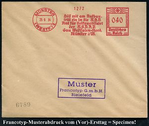 1566 | 25 € | NATIONALSOZIALISTISCHE DEUTSCHE ARBEITERPARTEI / N.S.D.A.P. : MÜNSTER/ (WESTF.) 1/ Hilf mit am Aufbau/ tritt ein in die N.S.V./ ..der N.S.D.A.P./ Gau Westfalen-Nord.. 1934 (25.6.) AFS-Musterabdruck Francotyp "Hakenkreuz" , glasklar gest. Francotyp-Muster-Bf. vom (Vor)-Ersttag!, selten! (Dü.E-3CEh) | ![]() ![]() | |