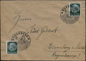 1571 | 15 € | NATIONALSOZIALISTISCHE DEUTSCHE ARBEITERPARTEI / N.S.D.A.P. : NÜRNBERG/ 50.Geburtstag des Führers/ DSDR 1939 (20.4.) SSt = Burg , 2x (Bf. schwache Falte u. kl. Seitenriß) klar gest. Inl.-Bf. (Bo.64) | ![]() | |