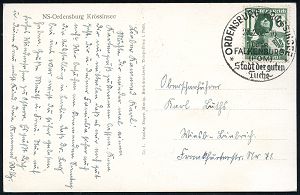 1560 | 35 € | NATIONALSOZIALISTISCHE DEUTSCHE ARBEITERPARTEI / N.S.D.A.P. : KRÖSSINSEE ORDENSBURG/ ÜBER/ FALKENBURG/ (POM)/ Stadt der guten/ Tuche 1938 (28.2.) HWSt = Hauspostamt NS-Ordensburg = NSDAP-Schulungsstätte für NS-Kader der mittleren Ebene , klar gest., passende s/w.-Foto-Ak.: Ordensburg-Seeterrasse, Bedarf (Bo.1) | ![]() ![]() | |