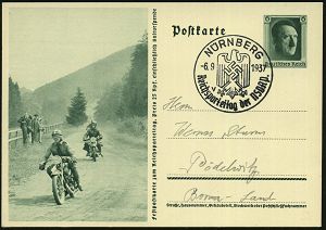 1568 | 14 € | NATIONALSOZIALISTISCHE DEUTSCHE ARBEITERPARTEI / N.S.D.A.P. : NÜRNBERG/ v/ Reichsparteitag der NSDAP 1937 (6.9.) SSt mit UB "v" auf Sonder-P 6 Pf. Hitler, grün: Reichsparteitag = N.S.K.K.-Motorrad-Rennen (Mi.P 265/05) klar gest. Inl.-Karte (Bo.52 v) | ![]() | |