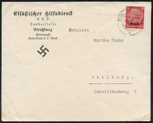1576 | 40 € | NATIONALSOZIALISTISCHE DEUTSCHE ARBEITERPARTEI / N.S.D.A.P. : DT.BES.ELSASS 1940 (19.10.) 2K-Steg: STRASSBURG (ELS) 2/a auf EF 12 Pf. Hindenbg. mit Aufdruck "Elsaß" auf Dienst-Bf.: Elsässischer Hilfsdienst E. H. D., Landesstelle Straßburg.. mit Hakenkreuz = politische Organisation zur Einführung u. Förderung der NSDAP in Elsaß-Lothringen!, seltener Fern-Bf. (Mi.8 EF) | ![]() | |