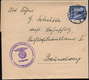 1558 | 16 € | NATIONALSOZIALISTISCHE DEUTSCHE ARBEITERPARTEI / N.S.D.A.P. : HANNOVER 1 1939 (1.12.) 1K-Brücke auf EF Parteidienst 4 Pf. + viol.HdN: NSDAP/Ortsgruppe/..Weißenkreuzplatz , dekoratives Zeitungs-Streifband an Bahnschutz-Führer,Braunschweig (Mi.D 146 EF) | ![]() | |