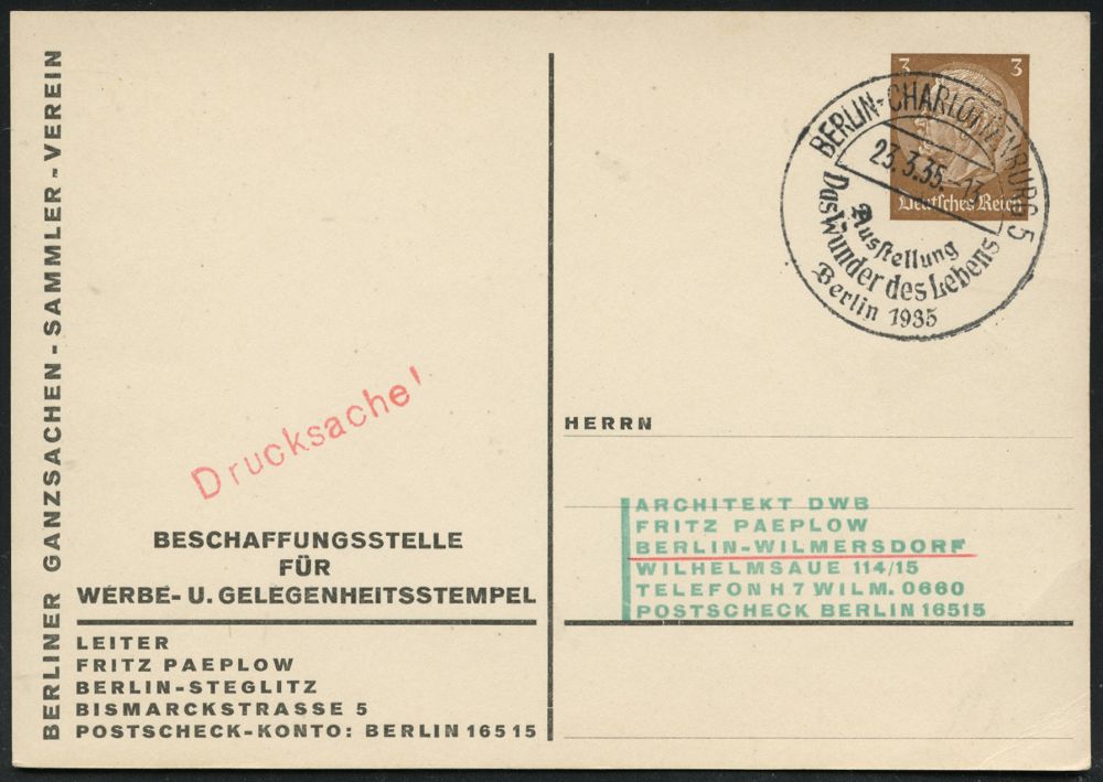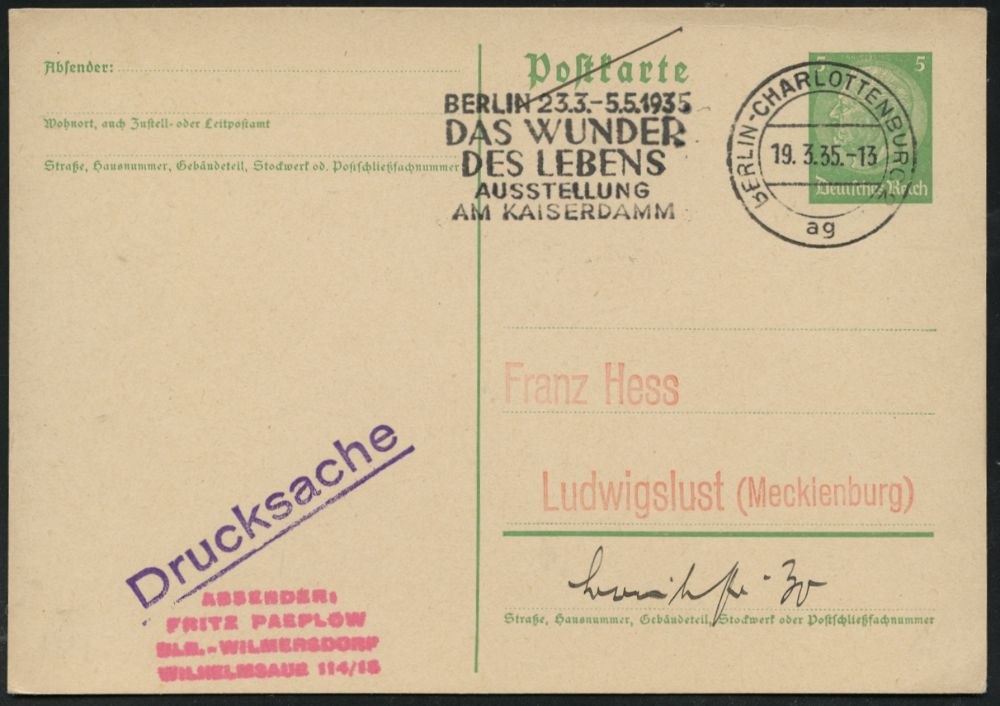 1626 | 28 € | NS-RASSENEUGENIK & EUTHANASIE : BERLIN-CHARLOTTENBURG 5/ Ausstellung/ Das Wunder des Lebens 1935 (23.3.) seltener SSt = Ausstellung zur NS-Rassen-Biologie, Euthanasie, Psychatrie, Himmler gründet 1935 "Lebensborn e.V." etc. , klar gest. Inl.-Drs.-Karte (Bo.162) | ![]() | |