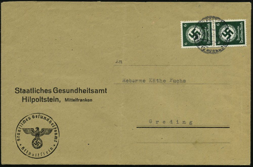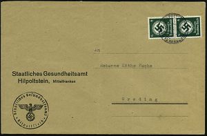 1629 | 25 € | NS-RASSENEUGENIK & EUTHANASIE : HILPOLTSTEIN/ b/ über/ ROTH (b NÜRNBERG) 1941 (20.6.) 2K-Steg = PSt.I auf Paar 6 Pf. Behördendienst, Dienst-Bf.: Staatl. Gesundheitsamt / Hilpoltstein (NS-Adler, Bf. Mittelfalte) NS-Gesundheitsämter waren in NS-Euthanasie verwickelt!, (Mi.D 135 MeF) | ![]() | |