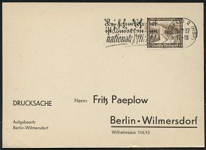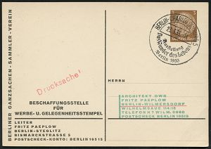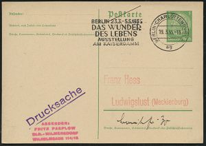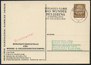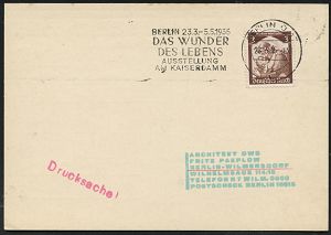 1623 | 25 € | NS-RASSENEUGENIK & EUTHANASIE : BERLIN N4/ w/ DAS WUNDER/ DES LEBENS/ AUSSTELLUNG/ AM KAISERDAMM 1935 (März) MWSt = Ausstellung für rassenbiologische Thematik (1935 gründete Himmler "Lebensborn e.V.") Ausstellung auch zum Thema "Euthanasie", Ausstellungs-Architekt Herbert Bayer (1900-85), Orts-Kt. (Bo.161 A V) | ![]() | |