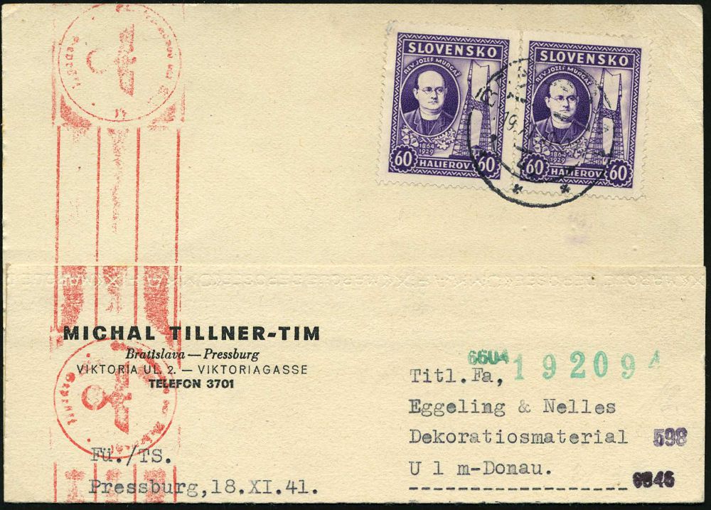 1707 | 18 € | DIE ACHSENMÄCHTE: DEUTSCHES REICH / ITALIEN / JAPAN / FINNLAND / BULGARIEN / KROATIEN / SLOWAKEI / UNGARN / RUMÄNIEN u. : SLOWAKEI 1941 (18.12.) 60 H. "10. Todestag Funk- u. Radio-Pionier J. Murgas", reine MeF: 2 Stück = Radio-Pionier (Brustbild, Sender) 2K: BRATISLAVA + roter Zensur-Band-MaSt "Geprüft" (= Wien, Rie.G-22) + grüner Zensur-Nrn.-Stpl., Ausl.-Zensur-Kt. n. Ulm (Mi.46 MeF) | ![]() | |