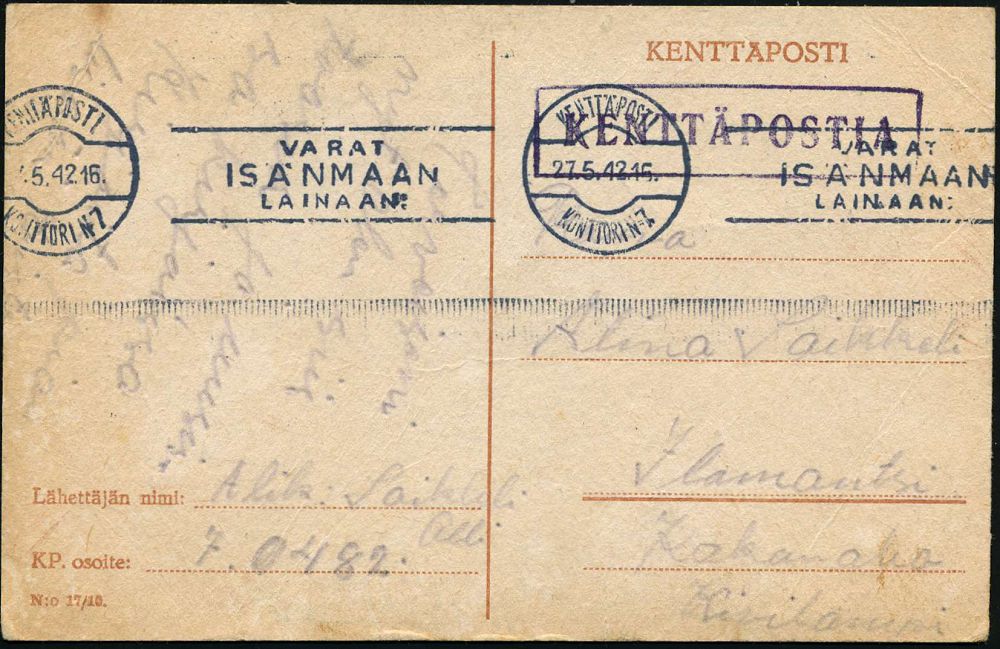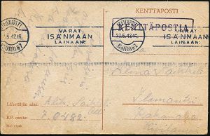 1687 | 15 € | DIE ACHSENMÄCHTE: DEUTSCHES REICH / ITALIEN / JAPAN / FINNLAND / BULGARIEN / KROATIEN / SLOWAKEI / UNGARN / RUMÄNIEN u. : FINNLAND 1942 (27.5.) Band-MaWSt.: KENTTÄPOSTI/KONTTORI 7/VARAT/ISÄNMAAN/LAINAAN klar auf Künstler-Humor-Feldp.-Ak., hs. Abs.: Fp.Nr. 7.0482 n. Jlamantsi, Finnland gehörte bis 1944 zu den Achsenmächten | ![]() ![]() | |
