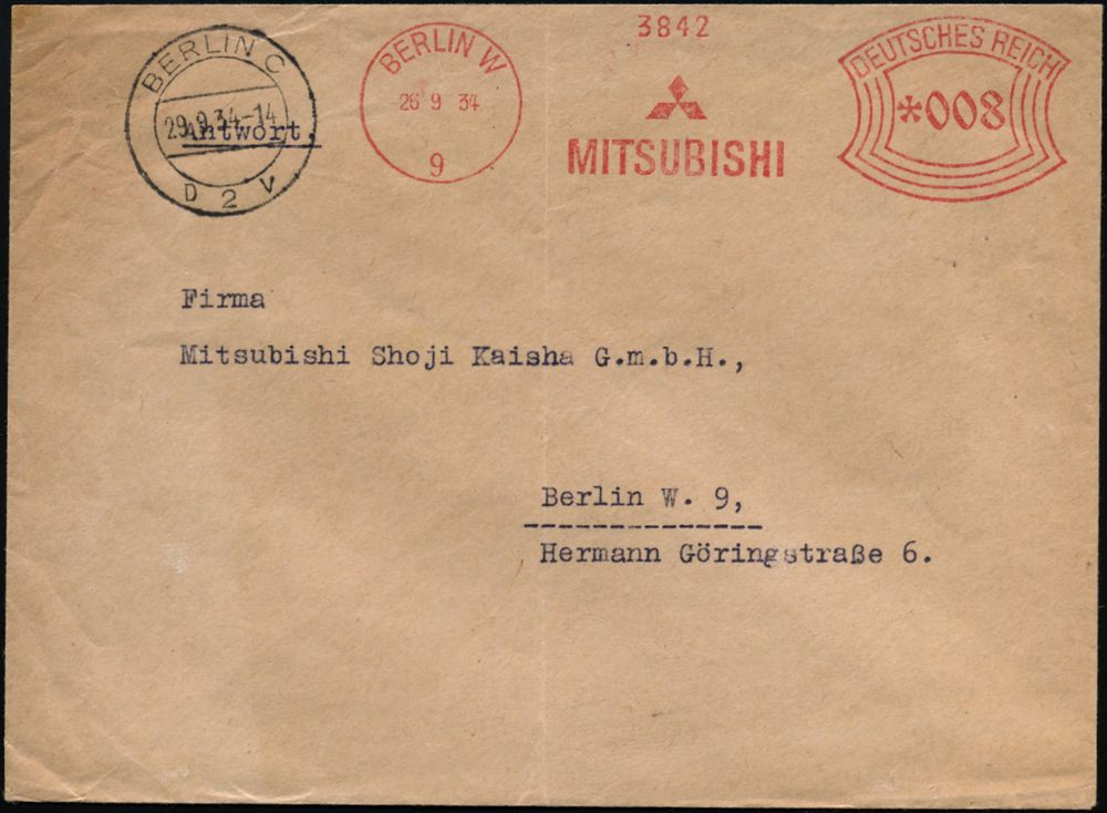 1679 | 25 € | DIE ACHSENMÄCHTE: DEUTSCHES REICH / ITALIEN / JAPAN / FINNLAND / BULGARIEN / KROATIEN / SLOWAKEI / UNGARN / RUMÄNIEN u. : BERLIN W/ 9/ MITSUBISHI 1934 (26.9.) seltener AFS Francotyp "Bogenrechteck" 008 Pf. = Mitsubishi-Logo (bis heute unverändert! = japan. Automobil- u. Rüstungs-Konzern!, 2K-Steg: BERLIN C/D 2 V, (wie immer gefalteter) seltener, vorausfrankierter Orts-Antwort-Bf., Japan trat am 27.9.1940 dem NS-3-Mächtepakt bei (Dü.Nr.55 = seltene Type) | ![]() | |
