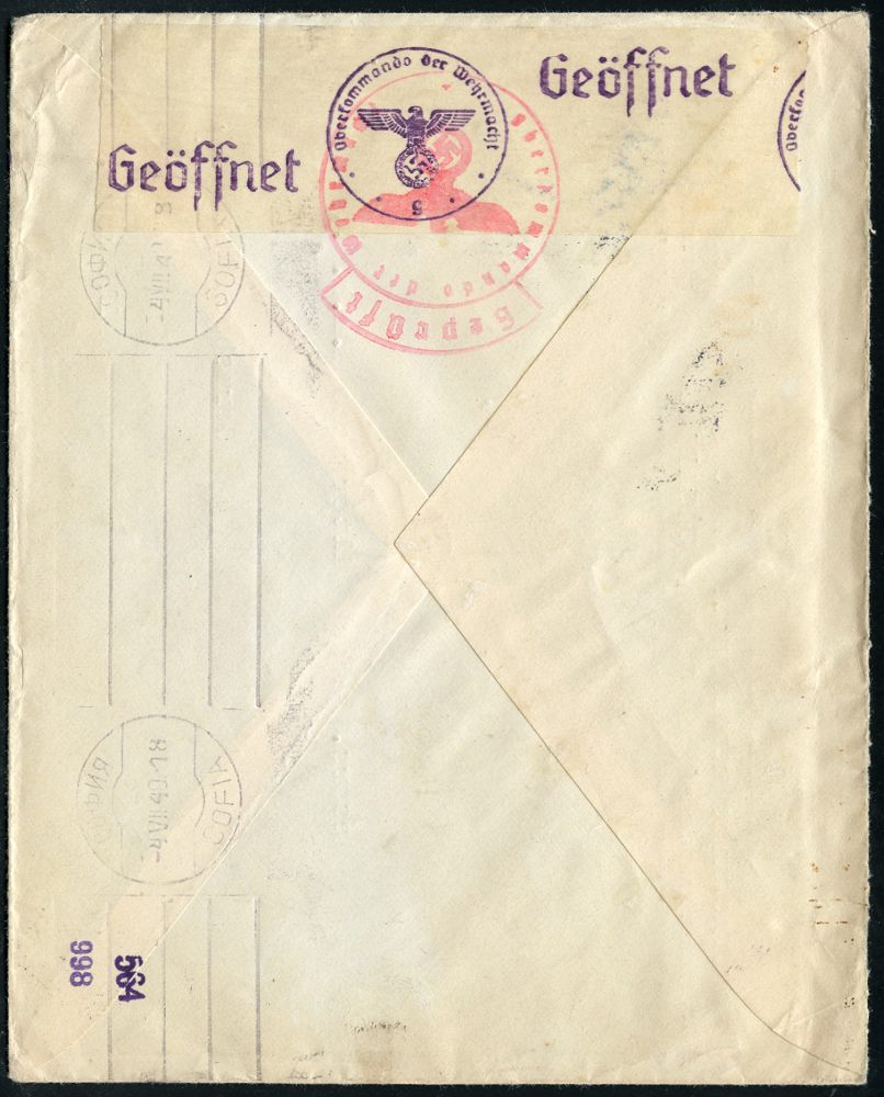 1683 | 40 € | DIE ACHSENMÄCHTE: DEUTSCHES REICH / ITALIEN / JAPAN / FINNLAND / BULGARIEN / KROATIEN / SLOWAKEI / UNGARN / RUMÄNIEN u. : BULGARIEN 1940 (5.7.) Flp.-Marke 1 Lewa, 1K: SOFIA + viol. 1L: Zurück, unzulässig! (Rie.75 b, + 750 Pkte.) + rs. OKW-Zensurzettel: Geöffnet/g ´roter 1K-Segment: Geprüft = Wien (Rie.G-1, G-53 a + 300 Pkte.), sehr seltener Firmen-Ausl.-Zensur-Retour-Bf. zus. Riemer 1050 Pkte.! n. Gernsbach, Baden (Mi.377 EF) | ![]() ![]() | |