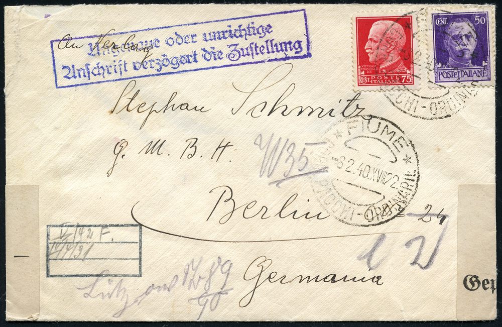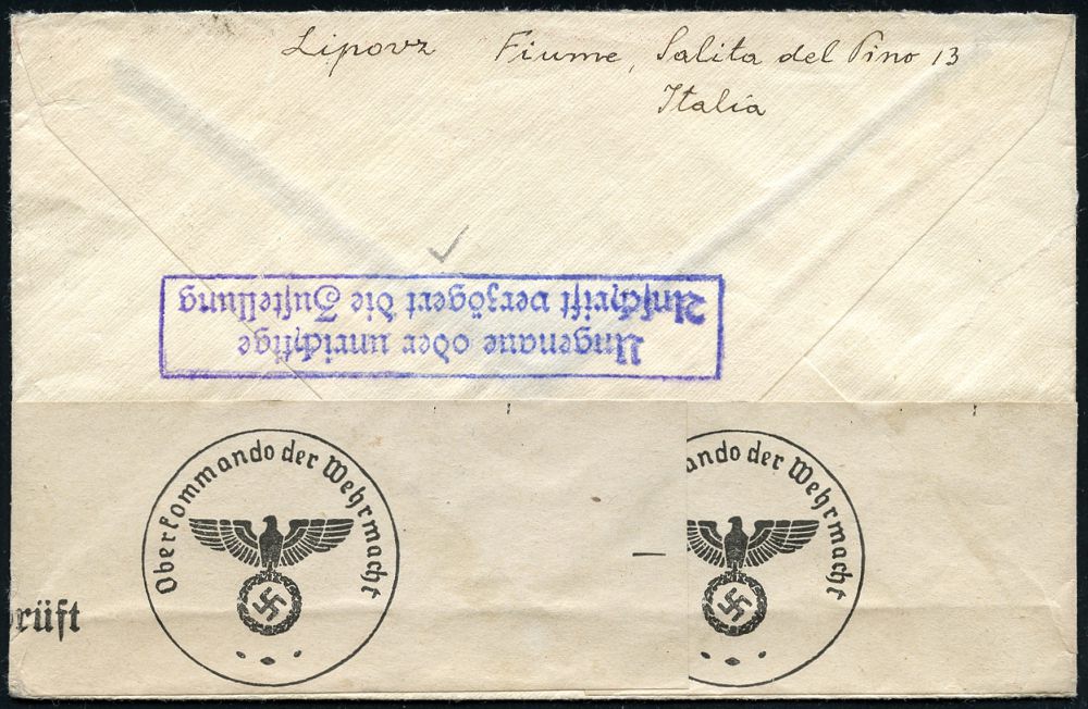 1692 | 20 € | DIE ACHSENMÄCHTE: DEUTSCHES REICH / ITALIEN / JAPAN / FINNLAND / BULGARIEN / KROATIEN / SLOWAKEI / UNGARN / RUMÄNIEN u. : ITALIEN 1940 (8.2.) 1K-Brücke: FIUME auf italien. Freimarken, Fiume im Vertrag von Rom zu Italien (ab 1947 Jugoslawien!) + OKW-Eingangs-Zensurstreifen "Geprüft" = Berlin (Rie.B-50 + 250 Pkte.) + 2x blauer Ra2: Ungenaue oder unrichtige/Anschrift verzögert die Zustellung, Ausl.-Zensur-Bf. n. Berlin | ![]() ![]() | |