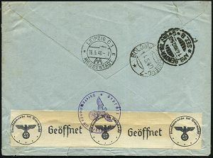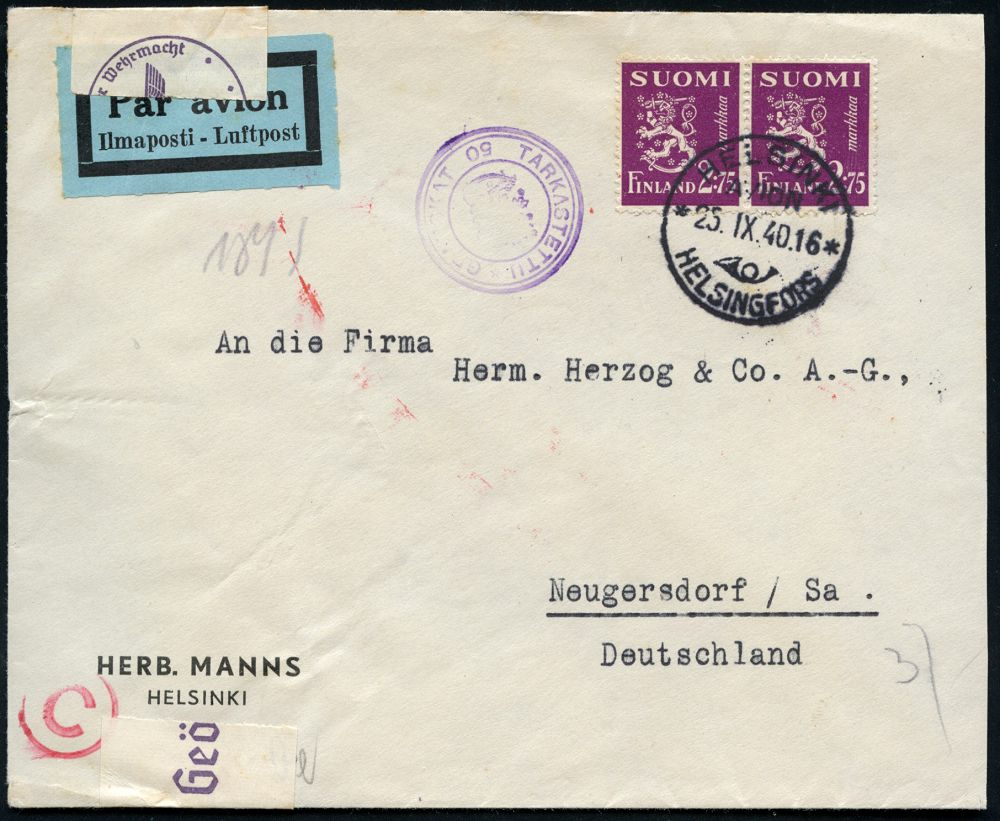 1685 | 18 € | DIE ACHSENMÄCHTE: DEUTSCHES REICH / ITALIEN / JAPAN / FINNLAND / BULGARIEN / KROATIEN / SLOWAKEI / UNGARN / RUMÄNIEN u. : FINNLAND 1940 (25.9.) 1K: HELSINKI/AVION auf 2x Freimarke 2,75 Mk. Wappenlöwe + viol.finn.Zensur-3K "50" (Wo.1) + OKW-Zensur-Streifen + 2x roter 1K o.UB (= Berlin, Rie.B-2 a , B-54, + 190 Pkte.) Ausl.-Flp-Doppel-Zensur-Bf. n. Neugersdorf (Mi.232, MeF) | ![]() ![]() | |