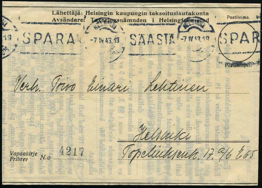 1688 | 14 € | DIE ACHSENMÄCHTE: DEUTSCHES REICH / ITALIEN / JAPAN / FINNLAND / BULGARIEN / KROATIEN / SLOWAKEI / UNGARN / RUMÄNIEN u. : FINNLAND 1943 (7.4.) Band-MWSt.: HELSINKI/ SPARA/ SÄÄSTÄ auf markenlosem Dienst-Bf.: Taxeringsnämnden i Helsingfors.. (innen zweisprachiger Vordruck) Steuermahnung, portofreier Orts-Bf. | ![]() ![]() | |