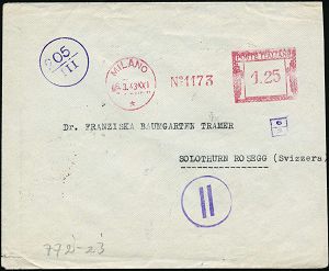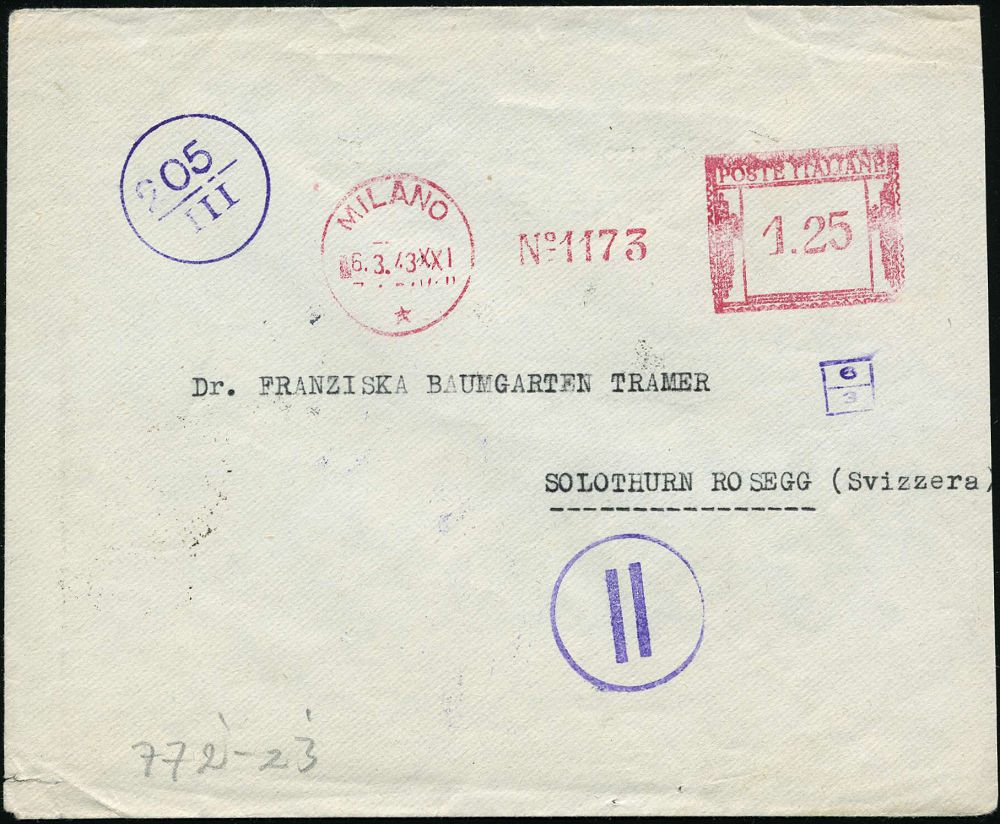 1697 | 18 € | DIE ACHSENMÄCHTE: DEUTSCHES REICH / ITALIEN / JAPAN / FINNLAND / BULGARIEN / KROATIEN / SLOWAKEI / UNGARN / RUMÄNIEN u. : ITALIEN 1943 (6.3.) anonymer AFS Francotyp "Liktorenbündel": MILANO/*/No.1173 = CONSIGLIO NAZ. DELLE RICERCHE.. PSICOLOGICA (rs. Abs.-Vordruck) rs. Zensur-Streifen: VERIFICATO PER CENSURA (Wo.8)+ viol. 2K: UFFICIO CENSURA POSTA ESTERA/*III*, Ausl.-Zensurbf. (in die Schweiz) | ![]() ![]() | |