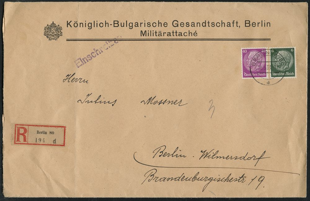 1680 | 18 € | DIE ACHSENMÄCHTE: DEUTSCHES REICH / ITALIEN / JAPAN / FINNLAND / BULGARIEN / KROATIEN / SLOWAKEI / UNGARN / RUMÄNIEN u. : BERLIN W 80/ d 1934 (10.5.) 2K-Steg auf 6 Pf. u. 40 Pf. Hindenbg. + RZ: Berlin 80/d , großer Dienst-Bf.: Königlich-Bulgarische Gesandtschaft, Berlin, Militärattaché (Wappen, Format ca. A5), klar gest. Orts-R-Bf. (Mi.516, 524) | ![]() | |