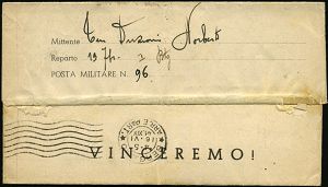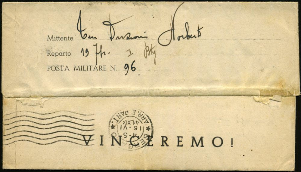 1694 | 18 € | DIE ACHSENMÄCHTE: DEUTSCHES REICH / ITALIEN / JAPAN / FINNLAND / BULGARIEN / KROATIEN / SLOWAKEI / UNGARN / RUMÄNIEN u. : ITALIEN 1941 (10.6.) 1K-Brücke: POSTA MILITARE/Nro 96 + rs. hs. Abs. + Propaganda-Zudruck: VINCEREMO ! (wir siegen!): , Luftpost-Falt-Bf.: P.N.F./FEDERANZIONE DEI FASCI DI COMBATTIMENTO DI MISURATA, Frankatur 50 C. + Flp. 50 C., Feldpost-Bf. mit Inhalt n.Bergamo (rs.AS) (Mi.307, 328) | ![]() ![]() | |