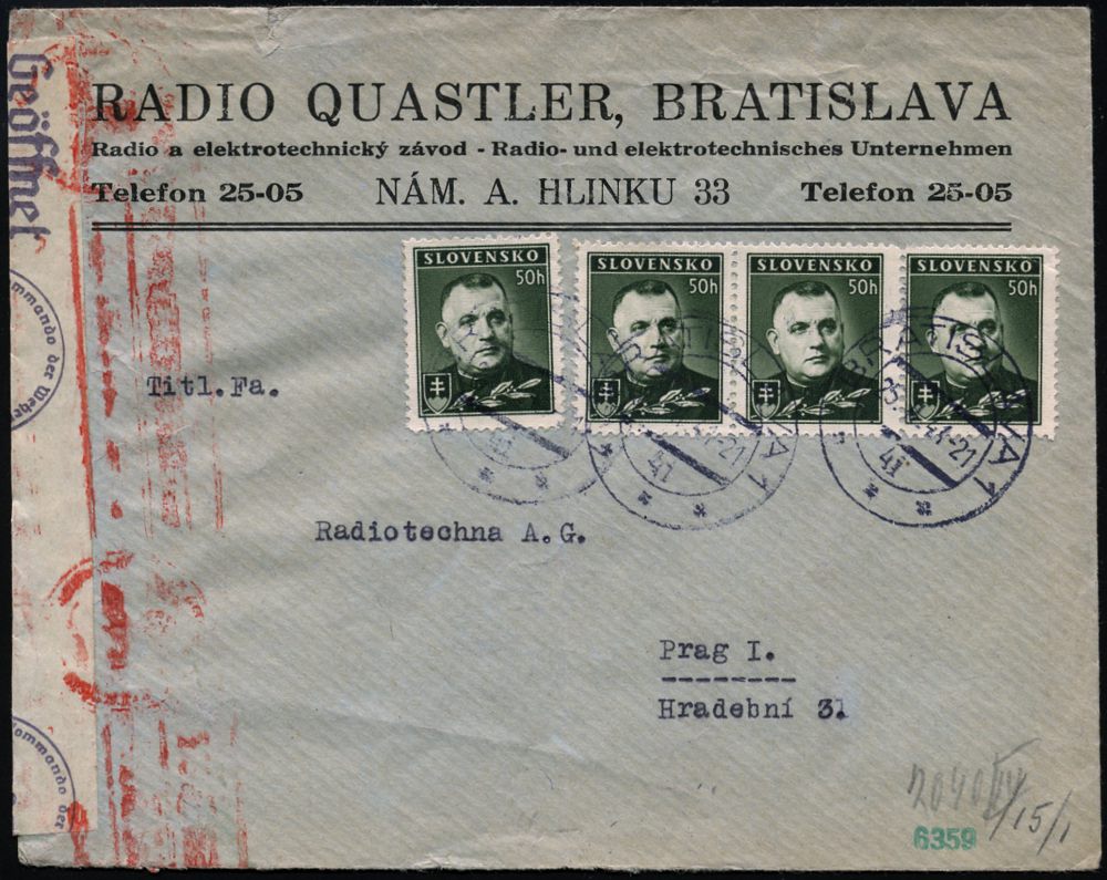 1706 | 16 € | DIE ACHSENMÄCHTE: DEUTSCHES REICH / ITALIEN / JAPAN / FINNLAND / BULGARIEN / KROATIEN / SLOWAKEI / UNGARN / RUMÄNIEN u. : SLOWAKEI 1941 (25.11.) 50 H. Tiso, grün, reine MeF: 4 Stück , 3x 2K: BRATISLAVA 1 + OKW-Zensurstreifen "Geöffnet/g" + roter Band-MaSt "Geprüft" (= Wien, Rie.G-22, G-53 a) Firmen-Bf.: RADIO QUASTER.. (oben kl. Riß) Ausl.-Zensur-Bf. n. Prag (Mi.67 MeF) | ![]() ![]() | |