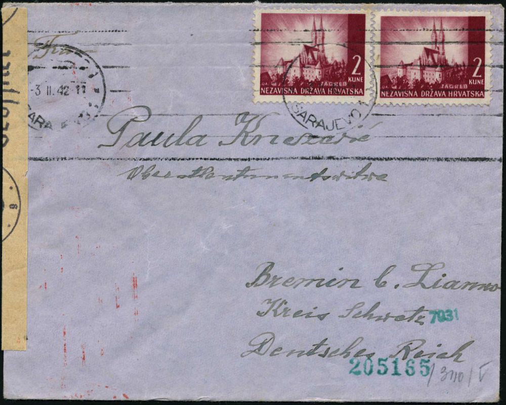 1698 | 18 € | DIE ACHSENMÄCHTE: DEUTSCHES REICH / ITALIEN / JAPAN / FINNLAND / BULGARIEN / KROATIEN / SLOWAKEI / UNGARN / RUMÄNIEN u. : KROATIEN 1942 (3.2.) 2 Kune. "Kathedrale Zagreb", reine MeF: 2 Stück, Band-MaSt.: SARAJEVO 1 + OKW-Zensurstreifen "g" (= Wien, Rie.G-24, G-53 a, + 55 Pkte.), Ausl.-Zensur-Bf. n. Bremin/Lianno (Mi.52 MeF) | ![]() ![]() | |