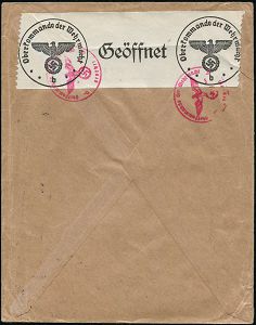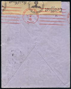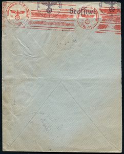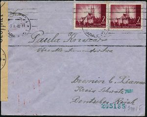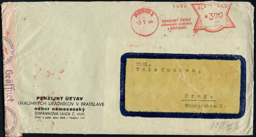 1708 | 30 € | DIE ACHSENMÄCHTE: DEUTSCHES REICH / ITALIEN / JAPAN / FINNLAND / BULGARIEN / KROATIEN / SLOWAKEI / UNGARN / RUMÄNIEN u. : SLOWAKEI 1944 (3.7.) AFS Francotyp "SLOVENSKO": BRATISLAVA 2/PENZIJNY USTAV.. + OKW-Zensurstreifen "Geöffnet/g" + roter Zensur-MaSt "Geprüft" = Wien (Rie.G-23 b, G-53 a, + 55 Pkte.) Ausl.-Zensur-Bf. n. Prag (Francotyp Ah) | ![]() ![]() | |
