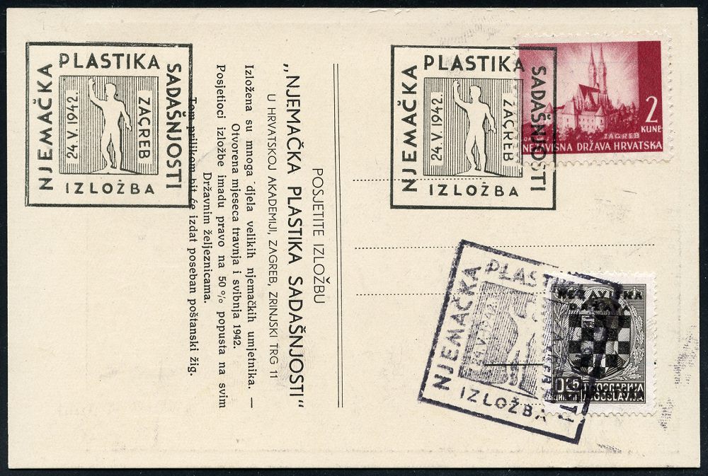 1699 | 30 € | DIE ACHSENMÄCHTE: DEUTSCHES REICH / ITALIEN / JAPAN / FINNLAND / BULGARIEN / KROATIEN / SLOWAKEI / UNGARN / RUMÄNIEN u. : KROATIEN 1942 (24.5.) SSt: ZAGREB/AUSSTELLUNG DEUTSCHE PLASTIK DER GEGENWART (stilis. Figur) 3x auf passender Ausstellung- u. Propaganda-Sonderkarte = Breker-Kopf! (o. A.), selten! | ![]() ![]() | |