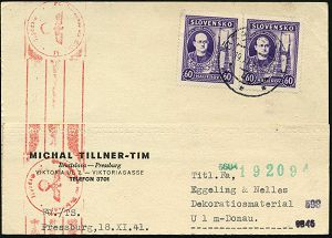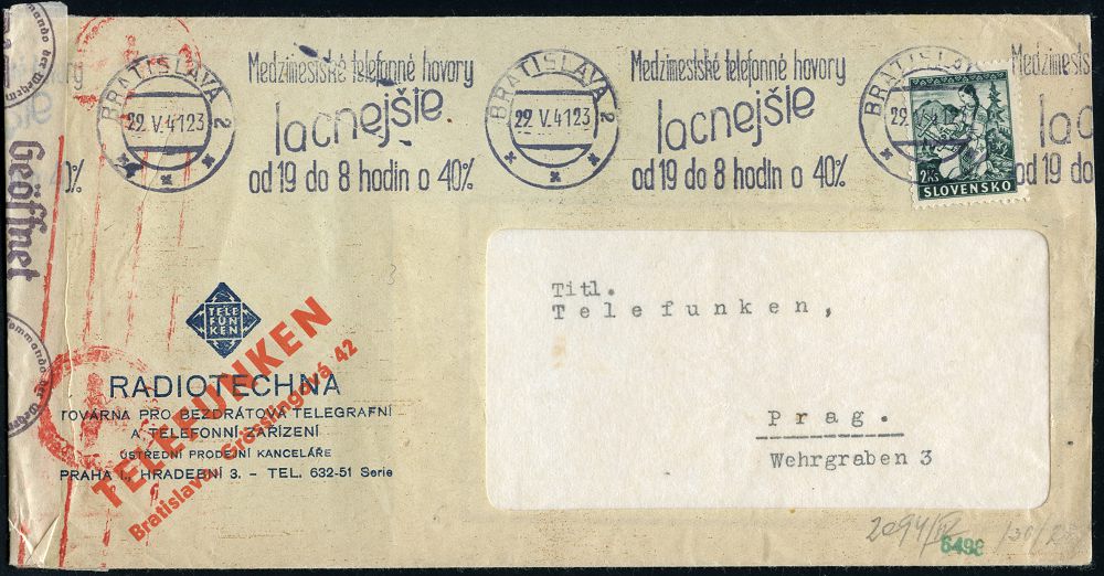 1704 | 20 € | DIE ACHSENMÄCHTE: DEUTSCHES REICH / ITALIEN / JAPAN / FINNLAND / BULGARIEN / KROATIEN / SLOWAKEI / UNGARN / RUMÄNIEN u. : SLOWAKEI 1940 (29.5.) Firmen-Bf.: TELEFUNKEN/RADIOTECHNA rot überdruckt: TELEFUNKEN Bratislava.. (Telefunken-Logo) EF 2 Ks. Mädchen m. Strickrahmen + rs. OKW-Zensur-Streifen "g" + roter Band-MaSt "Geprüft" = Wien (Rie.G-21, G-53 a) Ausl.-Zensur-Bf. n. Prag TELEFUNKEN = AEG-Rüstungsbetrieb (Mi.43 EF) | ![]() | |