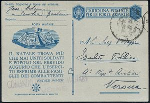 1696 | 12 € | DIE ACHSENMÄCHTE: DEUTSCHES REICH / ITALIEN / JAPAN / FINNLAND / BULGARIEN / KROATIEN / SLOWAKEI / UNGARN / RUMÄNIEN u. : ITALIEN 1943 (11.1.) illustrierte Feldpost-Kt. NATALE 1942 (Weihnachten) mit Militärzelt u. Flagge + viol. Abs. 2L (UDINE), Feldpost-Kt. n. Verona | ![]() | |