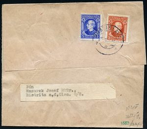 1702 | 20 € | DIE ACHSENMÄCHTE: DEUTSCHES REICH / ITALIEN / JAPAN / FINNLAND / BULGARIEN / KROATIEN / SLOWAKEI / UNGARN / RUMÄNIEN u. : SLOWAKEI 1940 (18.11.) 5 H. u. 20 H. Hlinka auf Zeitungs-Streifband , gest. BRATISLAVA, rs. OKW-Band-Zensurstempel: Geprüft = Wien (Rie.G-22 b + 50 Pkte.) Zensur-Streifband n. Bistritz (Mi.35, 37) | ![]() ![]() | |