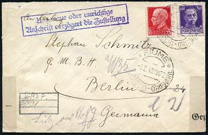 1689 | 18 € | DIE ACHSENMÄCHTE: DEUTSCHES REICH / ITALIEN / JAPAN / FINNLAND / BULGARIEN / KROATIEN / SLOWAKEI / UNGARN / RUMÄNIEN u. : FINNLAND 1942 (21.2.) Freiheitskampf 2 M. "Risto" u. 3,50 M. "Mannerheim" , satzreine Frankatur (Helsinki) + finn. Zensur-3K: "40" + OKW-Zensurstreifen u. 1K "b" (= Berlin, Rie.B-9, B-53 a, zus. + 100 Pkte.), Ausl.-Flp.-Doppel-Zensur-Bf. n.Bad Godesberg (Mi.244, 252) | ![]() ![]() | |