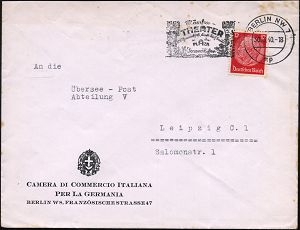 1682 | 15 € | DIE ACHSENMÄCHTE: DEUTSCHES REICH / ITALIEN / JAPAN / FINNLAND / BULGARIEN / KROATIEN / SLOWAKEI / UNGARN / RUMÄNIEN u. : Berlin W 8 1940 (30.3.) EF 12 Pf. Hindenbg., frankierter Dienst-Bf.: CAMERA DI COMMERCIO ITALIANA/PER LA GERMANIA.. = italien. Handelskammer mit Staatswappen (Bf. oben gering stockig) Inl.-Bf. n. Leipzig (Mi.519 EF) | ![]() | |