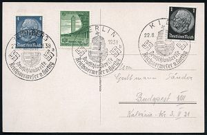 1681 | 25 € | DIE ACHSENMÄCHTE: DEUTSCHES REICH / ITALIEN / JAPAN / FINNLAND / BULGARIEN / KROATIEN / SLOWAKEI / UNGARN / RUMÄNIEN u. : BERLIN #bzw.# NÜRNBERG # bzw.# KIEL/ b/ Deutschlandreise/ Reichsverweser v.Horthy 1938 (22.8.) 3 verschiedene SSt (je ungar.Wappen) alle zusammen auf s./w.-Foto-Sonderkarte: Staatstreffen Hitler - v. Horthy (Kopfbilder Hitler, v. Horthy) Ausl.-Kt. n. Ungarn, seltene Kombination! (Bo.39 b, 282 b, 61 a) | ![]() ![]() | |