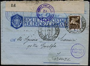 1695 | 20 € | DIE ACHSENMÄCHTE: DEUTSCHES REICH / ITALIEN / JAPAN / FINNLAND / BULGARIEN / KROATIEN / SLOWAKEI / UNGARN / RUMÄNIEN u. : ITALIEN 1942 (9.4.) 50 C. Pegasus, EF = Luftpost-Zuschlag , 1K-Brücke: UFFICIO POSTALA MILITARE/Nro 99 + Zensurstreifen: Verificato per censura/F I + viol. 2K: COMMISSIONE PROV. CENSURA DI GUERRA/F I/* (Wo. unbekannt!) + 2 weitere Zensur-Eingangsstpl. (hs. Abs. 84° Rgt. Fanteria) Feldpost-Doppel-Zensur-Bf. mit Inhalt n. Firenze (Mi.328 EF) | ![]() ![]() | |