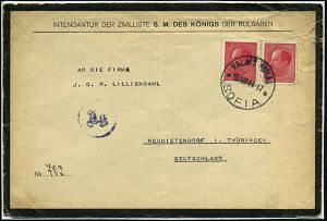 1684 | 30 € | DIE ACHSENMÄCHTE: DEUTSCHES REICH / ITALIEN / JAPAN / FINNLAND / BULGARIEN / KROATIEN / SLOWAKEI / UNGARN / RUMÄNIEN u. : BULGARIEN 1944 (13.8.) 1K: P A L A I S R O Y A L = Hauspostamt Königl. Schlloß, 2x 2 L. Zar Boris III. (1x Mäng.) + blauer OKW-Zensur-1K: A g = Wien (Rie.G-32, 500 Pkte.!) Trauer-Vordr.-Bf.: INTENDATUR DER ZIVILLISTE S.M. DES KÖNIGS DER BULGAREN (rechtr Riß) rs. Blind-Prägewappen u. HdN, seltener Ausl.-Trauer-Zensurbf. n. Neudietendorf/Thür. (Mi.396 MeF) | ![]() ![]() | |
