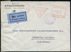 1686 | 18 € | DIE ACHSENMÄCHTE: DEUTSCHES REICH / ITALIEN / JAPAN / FINNLAND / BULGARIEN / KROATIEN / SLOWAKEI / UNGARN / RUMÄNIEN u. : FINNLAND 1942 (20.1.) AFS Francotyp *550 P.: HELSINKI/ HELSINGFORS/Stockmann.. + viol. finnischer Zensur-3K (Wo.1) + rs. OKW-Zensurstreifen Geöffnet + roter 1K: geprüft/b mit Tilde (= Berlin, Rie.B-55 etc.) Ausl.-Flp.-Zensur-Bf. n. Hohenberg/Eger (Francotyp CBh) | ![]() ![]() | |