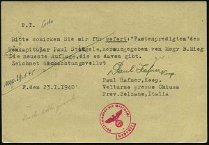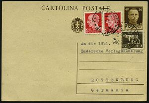 1691 | 20 € | DIE ACHSENMÄCHTE: DEUTSCHES REICH / ITALIEN / JAPAN / FINNLAND / BULGARIEN / KROATIEN / SLOWAKEI / UNGARN / RUMÄNIEN u. : ITALIEN 1940 (24.1.) amtl. P 30 C. Victor Emanuel III., braun + Zusatzfrankatur, 1K: BOLZANO , rs. roter, kleiner, seltener Zensur-1K: Geprüft.. = München (Rie.D-1, + 200 Pkte) Ausl.-Zensur-Kt., rs. Text über "Fasten-Predigt"! n. Rottenburg (Mi.P 85, Mi.299, 2x 303 = Caesar) | ![]() ![]() | |