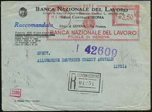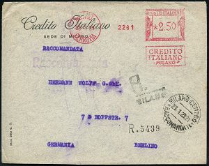 1690 | 20 € | DIE ACHSENMÄCHTE: DEUTSCHES REICH / ITALIEN / JAPAN / FINNLAND / BULGARIEN / KROATIEN / SLOWAKEI / UNGARN / RUMÄNIEN u. : ITALIEN 1929 (23.1.) AFS Francotyp "Liktorenbündel": MILANO-/FERROVIA/CREDITO/ITALIANO 2,50 L. + R-Stempel: R./MILANO + R.-Paginiernr. (vierstellig) , 1K: MILANO CENTRO/RACOMMANDATA + rs. Bahn-1K: AMB.MILANO-DOMODOSSOLA/67 n. Berlin, die Liktorenbündel waren Symbole des italien. Faschismus (Francotyp Am) | ![]() ![]() | |